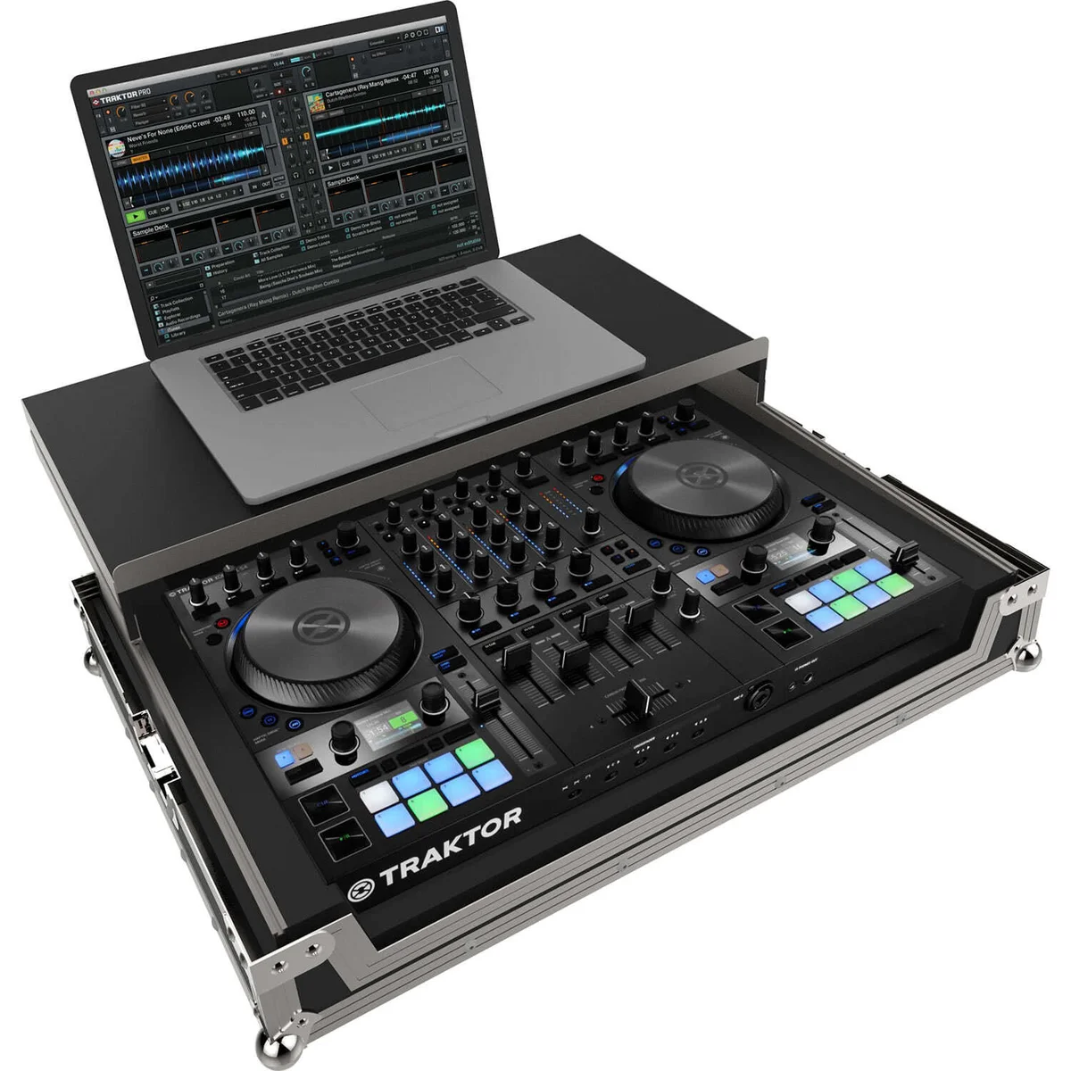 Flightcase profesional PEP FC-S4 MK3 cu raft retractabil pentru laptop, proiectat pe măsură pentru controllerul Native Instruments Traktor Kontrol S4 MK3 – protecție optimă și acces facil la comenzi.