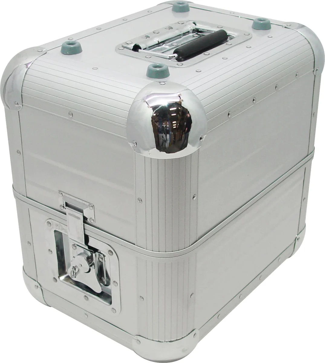 Recordcase profesional Zomo MP-80 XT argintiu, cu capacitate de cca. 80 de viniluri 12", construcție robustă din aluminiu și colțuri ranforsate pentru protecție maximă în transport.