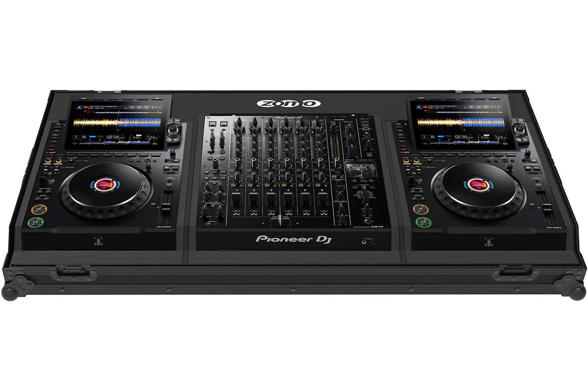 Flightcase profesional Zomo Set-3010X NSE pentru 2x Alphatheta CDJ-3000X și 1x Pioneer DJ DJM-V10/DJM-V10LF, cu finisaj negru mat, placaj laminat de 9 mm, roți integrate și canal de cabluri.